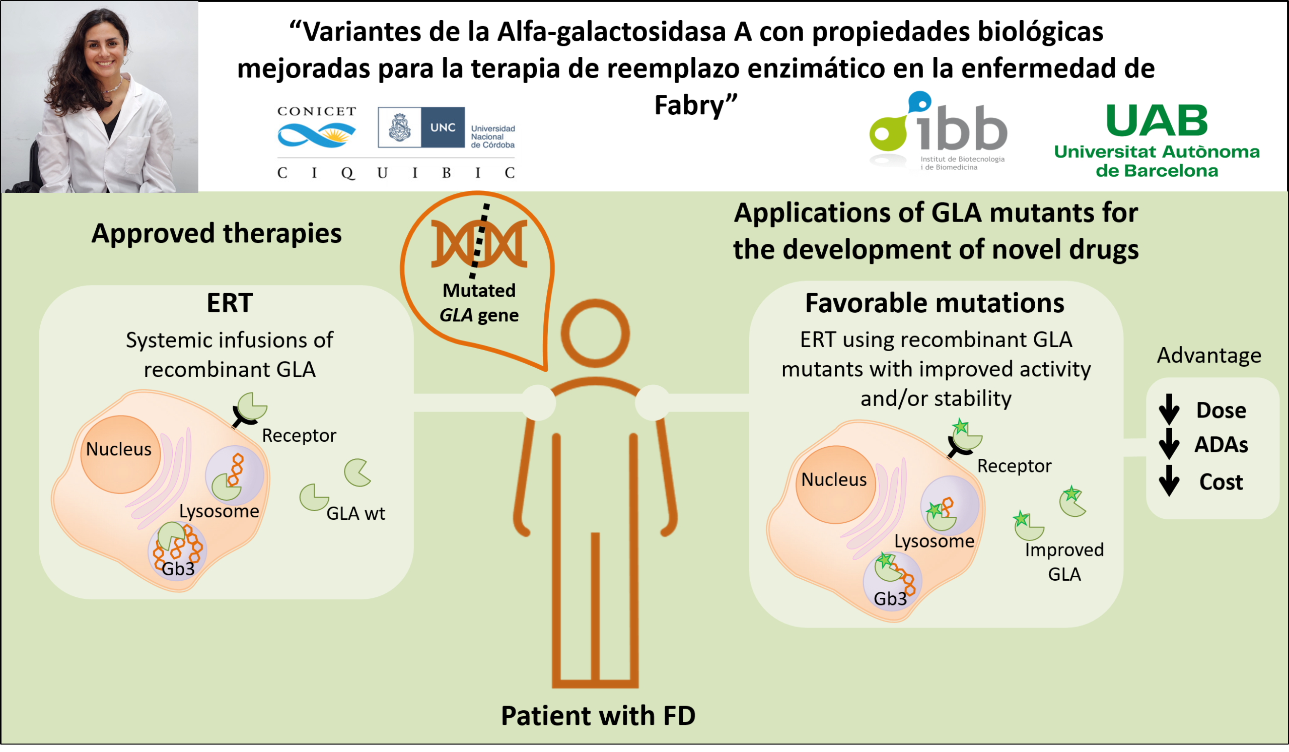 Durante esta experiencia, trabajará en el proyecto “Variantes de la alfa-galactosidasa A con propiedades biológicas mejoradas para la terapia de reemplazo enzimático en la enfermedad de Fabry”, orientado al desarrollo de mutantes de GLA con mayor actividad, estabilidad y potencial terapéutico.